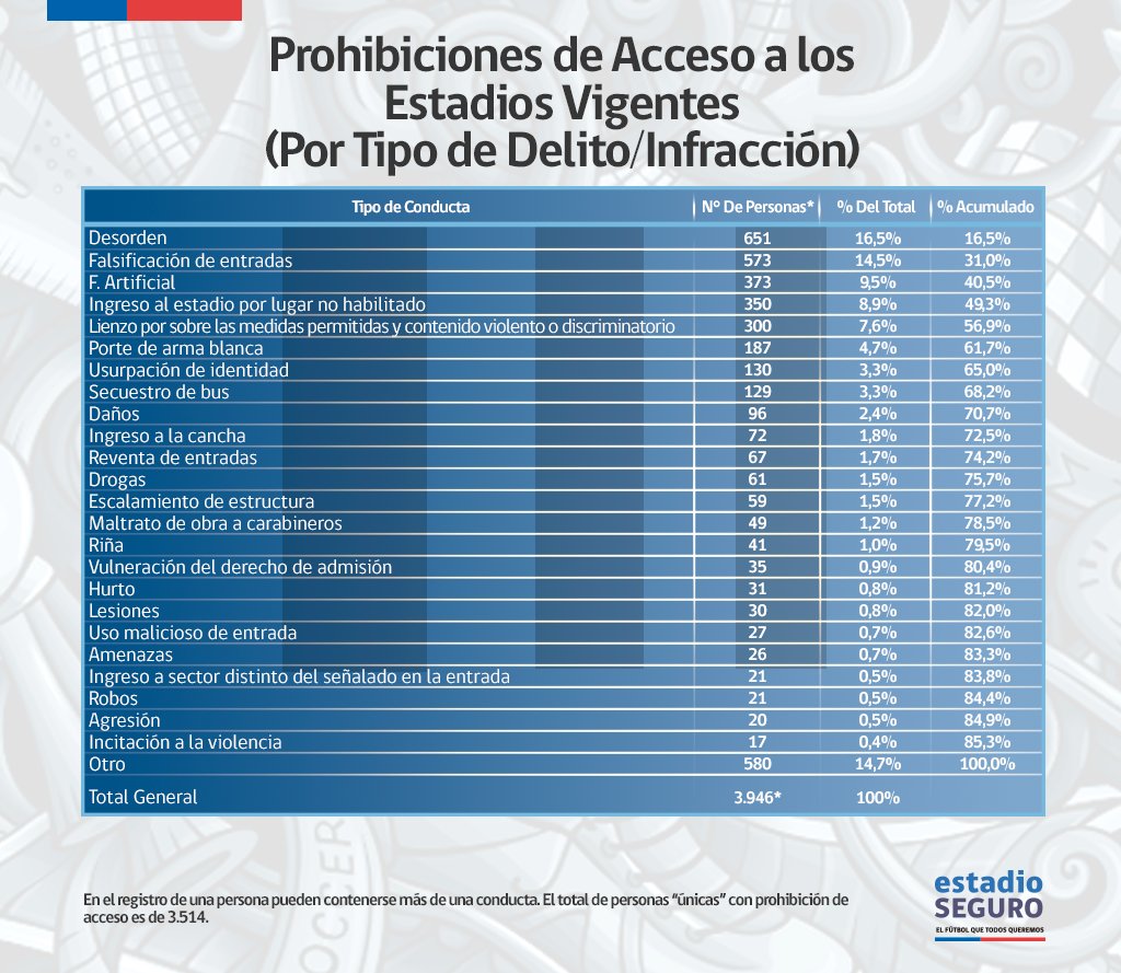 Entre los 3.514 sancionados, destacan quienes han cometido desórdenes (651 personas), falsificación de entradas (573), detonación o porte de fuegos artificiales (373) e ingreso a los estadios por lugares no habilitados (350), entre otros. Destaca como hecho emblemático a los tres hinchas de Colo Colo responsables de los incidentes en el superclásico, que por la acumulación de infracciones que cometieron ese día, quedaron con 11 años y seis meses sin poder ingresar a ningún estadio de Chile.