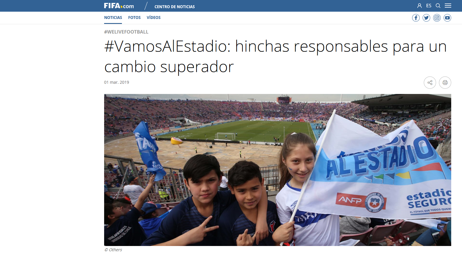 El portal de noticias FIFA.com destacó la iniciativa “Vamos al estadio” campaña realizada desde el 2018 la que busca que hinchas de diferentes equipos puedan compartir en un mismo lugar del estadio un partido de fútbol en un ambiente de respeto y amistad.