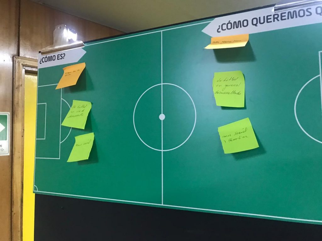 La primera actividad de los Diálogos Futboleros consta de responder las siguientes interrogantes “¿Cómo es el fútbol de hoy” “¿Cómo quieren que sea?”, cuyas respuestas son rescatadas por los monitores preparados para la actividad, y posteriormente expuestas frente a todos los grupos en formato exposición.